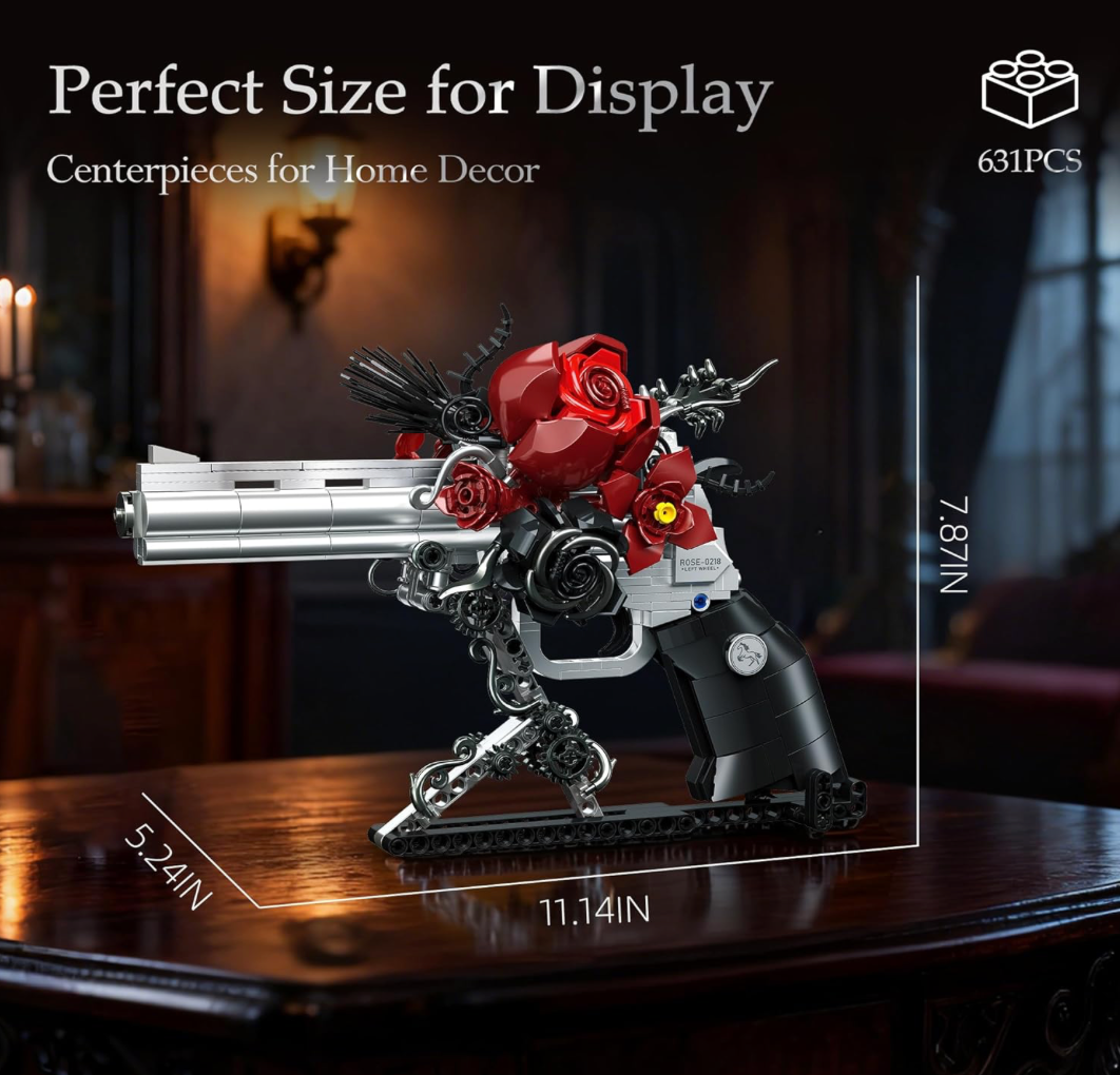Gears & Petals Bricks fuses brushed-steel gearwork with crimson rose petals in a 631-piece adult brick display. The barrel, cylinder, and trigger move, delivering that satisfying “click” as the model comes to life. Designed to look great on a desk, shelf, or studio next to your records—more showpiece than toy.